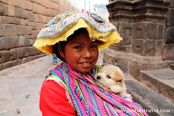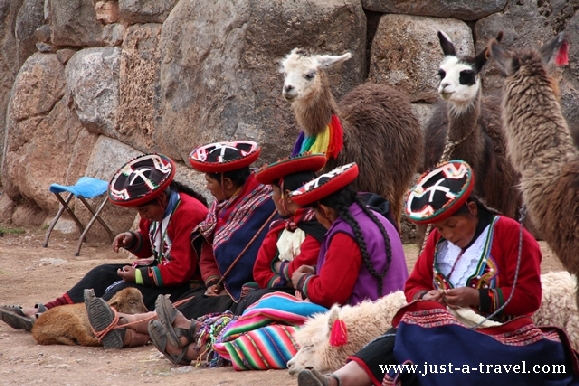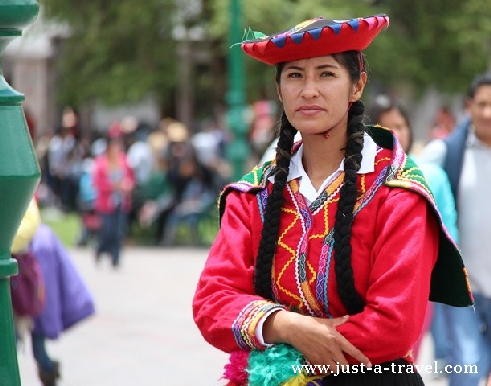 Peruwianki chętnie noszą swój tradycyjny strój, składający się z kilku warstw kolorowej plisowanej spódnicy, czerwonej kamizelki, kapelusika i chusty, przewiązanej przez plecy, w której nosi się dziecko lub towar do sprzedania.