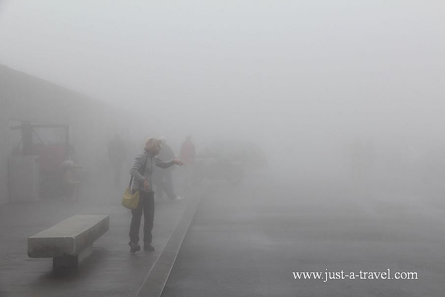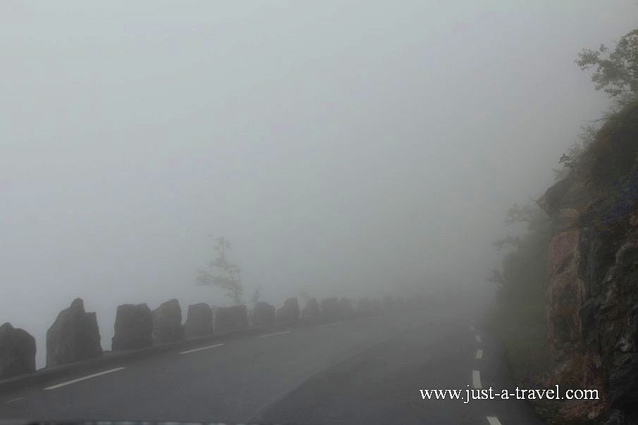 Droga jest otwarta, więc zaczynamy wspinaczkę! W tak gęstej mgle nigdy jeszcze nie jechaliśmy, widoczność zerowa i kiedy to nagle przed naszą maską znikąd pojawia się mlecznobiały pick-up włosy stają nam dębem. Dalej suniemy w ślimaczym tempie. Mgła dosłownie włazi nam do samochodu, wytrzeszczamy oczy, żeby nie wjechać w jakąś przeszkodę.