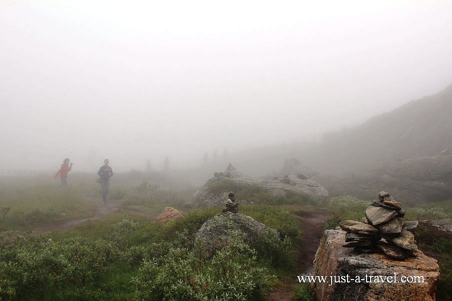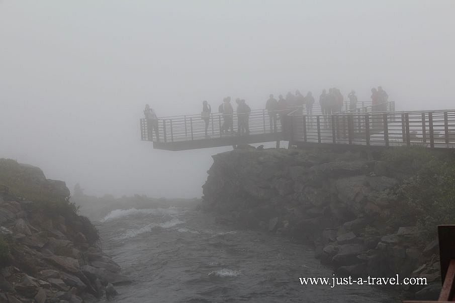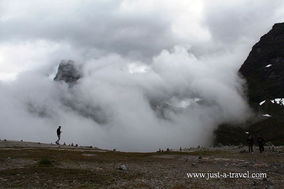 W połowie drogi ma się znajdować potężny wodospad Stigfossen z kamiennym mostem, po którym ponoć mieliśmy przyjemność przejechać. Ani wodospadu ani mostu nie widzimy. Wzrok odzyskujemy częściowo na szczycie płaskowyżu, gdzie parkujemy samochód i brodząc we mgle idziemy na platformę widokową Utsikten, skąd przy ładnej pogodzie widać całą Drogę Trolli.