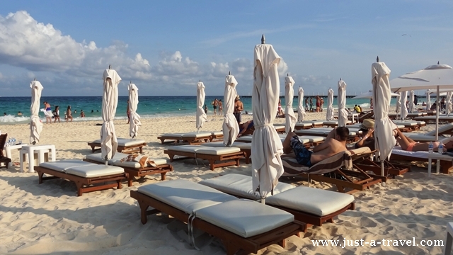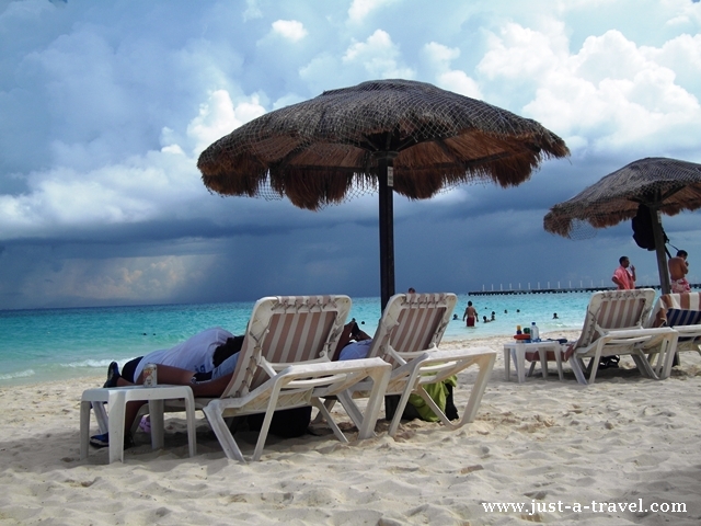 … miejscowi chowają się przed palącym słońcem pod własnym parasolem bądź szukają innych zacienionych miejsc. 90 pesos za parasol i dwa leżaki to dla nich spory wydatek.