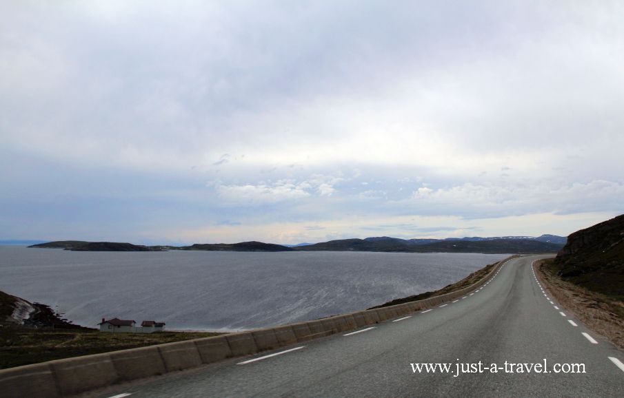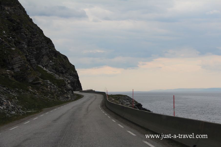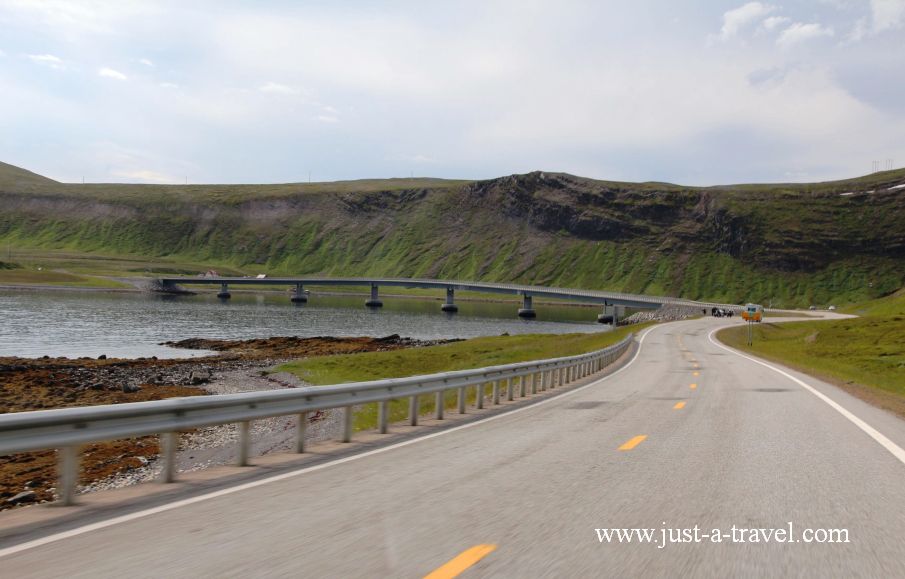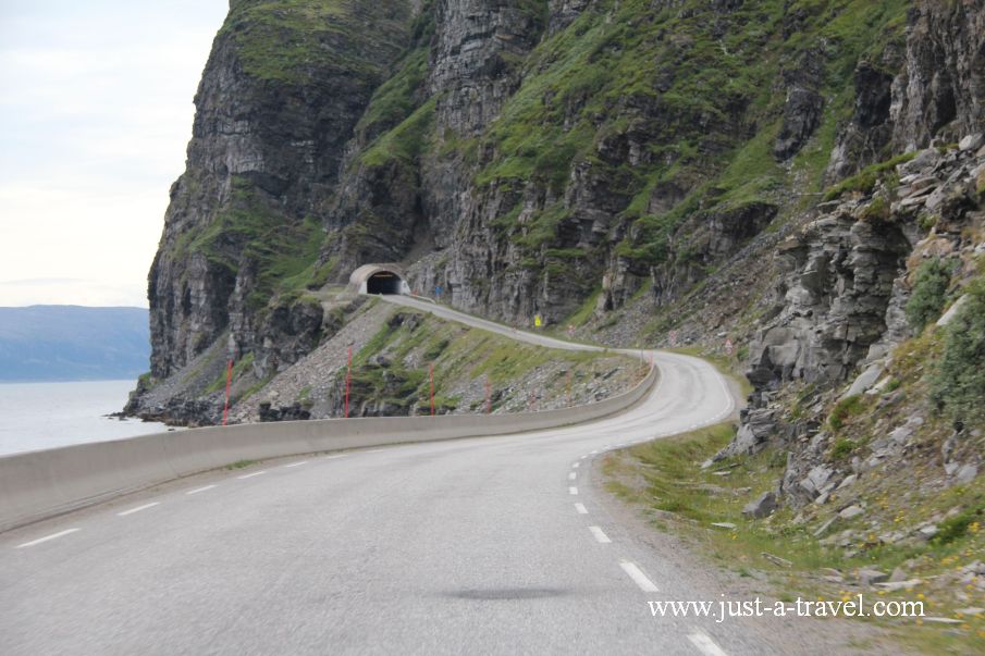Im dalej na północ, tym skąpsza się robi roślinność, bujne łąki zamieniają się w kamieniste podłoże. Aż w końcu docieramy do drogi krajowej E69 biegnącej wzdłuż Porsangerfjorden, doprowadzi nas ona do samego Honningsvag. Cała trasa jest bardzo malownicza. Fiord Porsangerfjorden mocno wcina się w dolomitowe skały, w których wykute są liczne tunele. A brzegi fiordu łączą liczne mosty.
