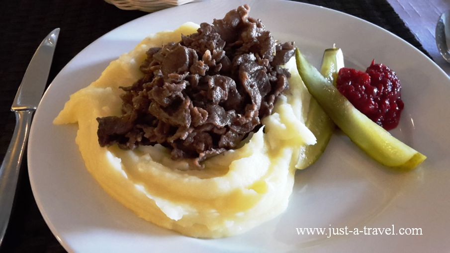 Na pożegnanie z Laponią kosztujemy „poronkäristys” – tradycyjnego dania w Laponii, składającego się ze smażonych kawałków mięsa z renifera z ziemniaczanym puree, borówką i ogórkami konserwowymi. Mięso z renifera jest ulubionym przysmakiem wszystkich krajów Skandynawskich, ale szczególnie w północnej części Finlandii jest ono spotykane w każdej postaci: smażone, suszone, wędzone, czy też na surowo. Można nawet zamówić pizzę z mięsem z renifera.