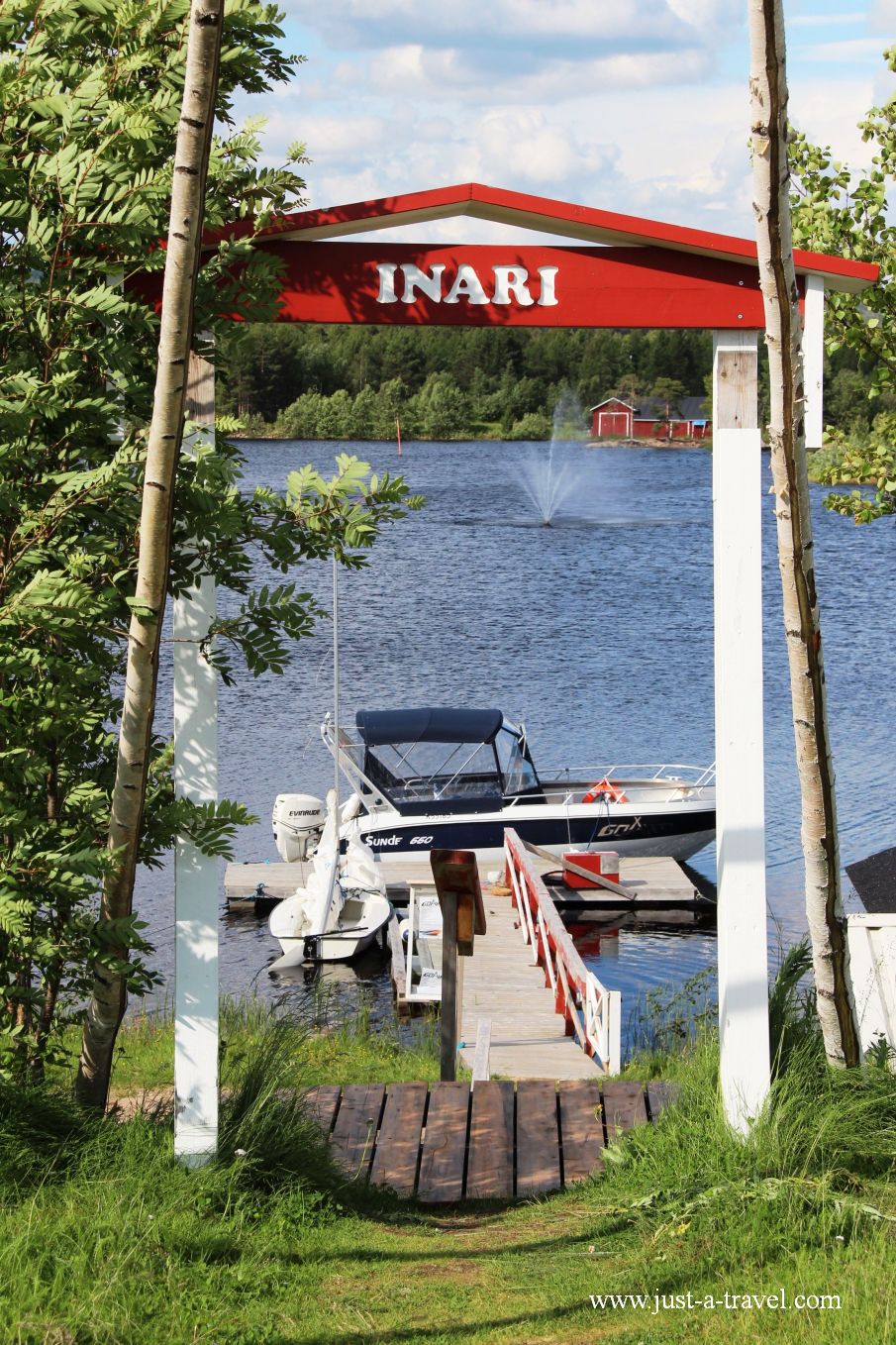 Dojeżdżamy do Inari. Okolica piękna, niebieskie niebo, słońce świeci pełną gębą, chociaż jest już późny wieczór. Niepewnie wychodzę z samochodu na pierwsze rozeznanie, czy i tym razem nie zostaniemy przegonieni przez chmarę komarów. Wygląda dobrze, jest wietrznie a komary wiatru nie lubią. Można wysiadać.