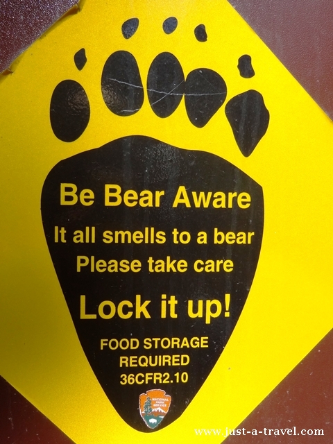 Park Narodowy Grand Teton zamieszkiwany jest przez niedźwiedzie, które nie stronią od odwiedzin miejsc, gdzie przebywają turyści. Corocznie zdarza się kilka śmiertelnych przypadków spotkań turystów z tymi milutkimi zwierzakami. „Be bear aware” przestrzegają na każdym kroku żółte nalepki. Jedzenie i wszystko, co może pachnąć niedżwiadkowi, trzeba przechowywać w specjalnych kontenerach. I uwaga łasuchy! Podjadanie ciastek nocą w namiocie, to nie najlepszy pomysł. Uzbrojeni w gaz na niedźwiedzie, gwizdek i młotek zapadliśmy w błogi sen na łonie natury.