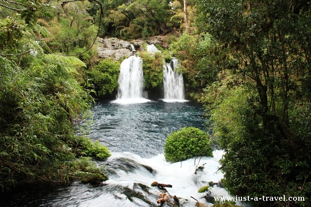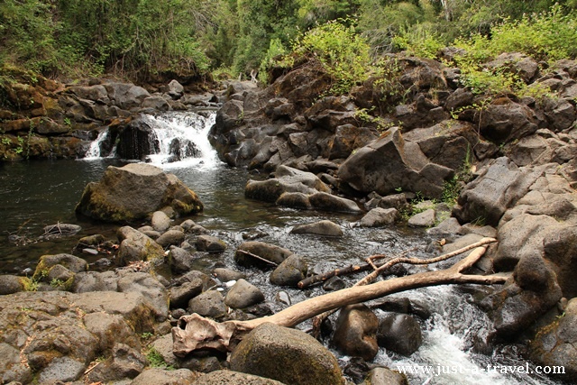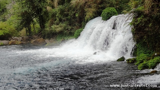 Nasze pierwsze kroki kierujemy do Ojos del Caburgua, malowniczego kompleksu wodospadów, spadających z wysokości 15-20 metrów do rwącej rzeki. Punkty widokowe wokół wodospadów połączone są mostkami i kameralną ścieżką. Na drugą stronę rzeki przechodzimy po wąskim konarze.