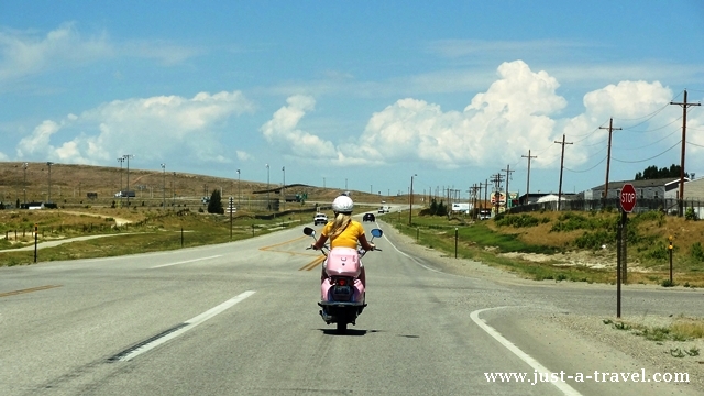 W drodze do Riverton mieliśmy okazję przekonać się, że kawały o blondynkach mają w sobie czasami trochę prawdy. Przez parę kilometrów musieliśmy podążać ślimaczym tempem za panienką na różowym motocyklu, która jechała samym środkiem ulicy i nie wpadło jej do głowy, żeby przepuścić powstały przez nią sznur samochodów.